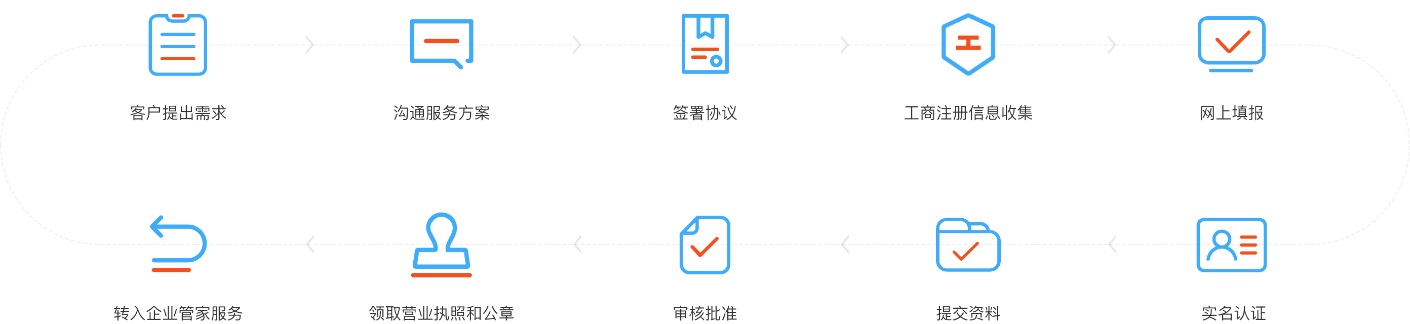 指导客户完成工商注册信息收集、负责网上填报、名称和经营范围核准、提交工商注册资料、经客户授权领取营业执照与公章